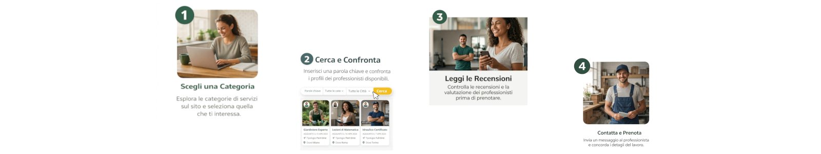ValutazioneSfoglia le card degli annunci. Guarda la foto e leggi le esperienze passate.Sceglo i profili con descrizioni accurate: sono i più affidabili.